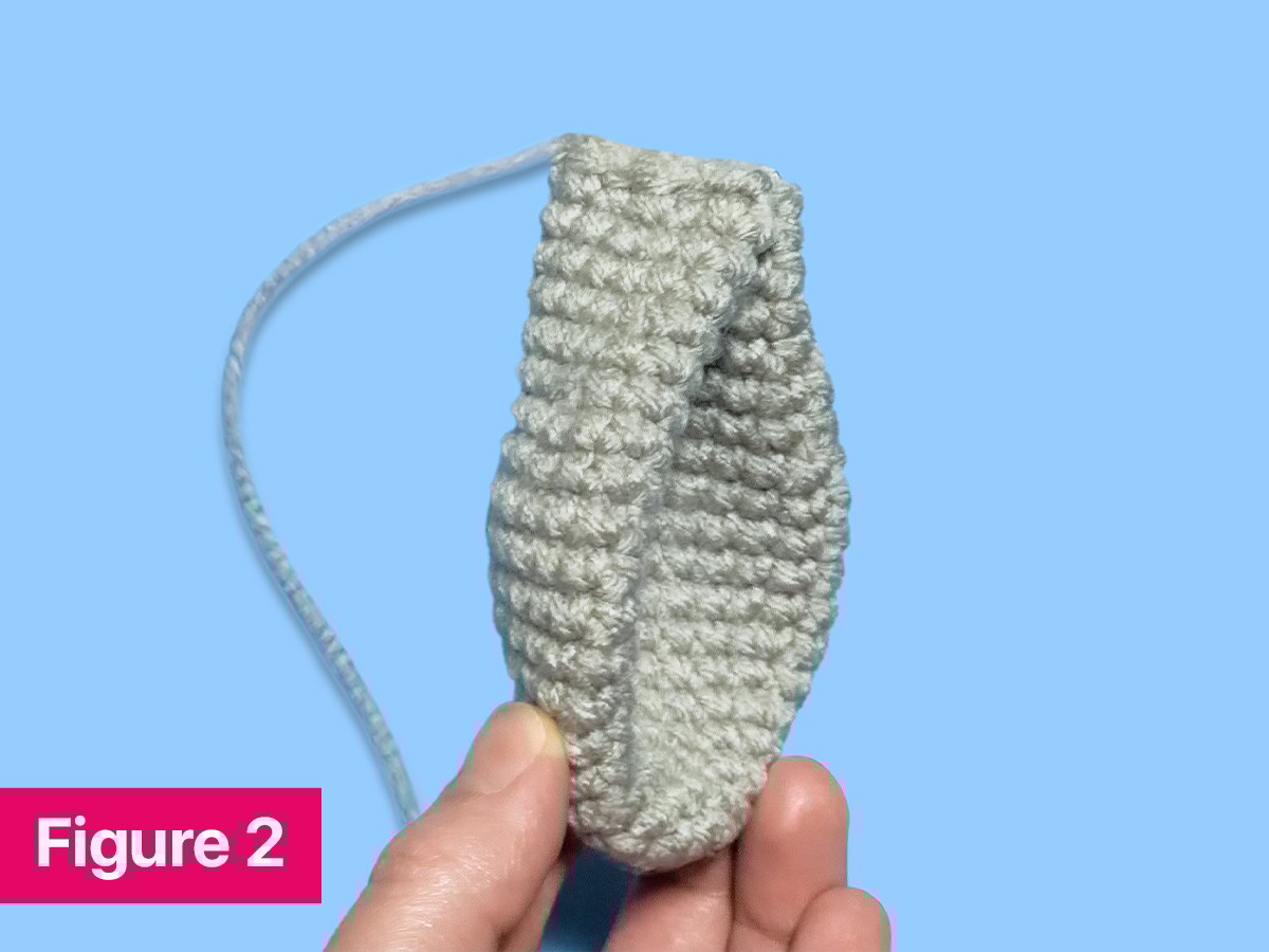 Creating a Folded Base for the Ear: Thread the remaining yarn tail through a yarn needle. Fold the final slip stitched edge in half and sew it closed with a running stitch (see Figure 1). Fasten off with a knot and leave the remaining yarn tail. The ears are now ready to sew to the head at a later step (see Figure 2).