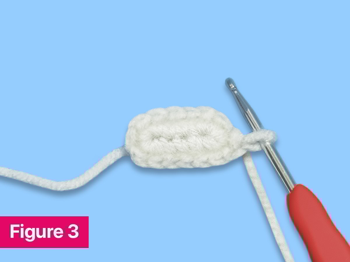 01. Chain 5 Start: inc in 2nd ch from hook, sc 2, sc 5 in last ch. Working on opposite side of chain base: sc 2, sc 3 in last ch (see Figure 3) [14]