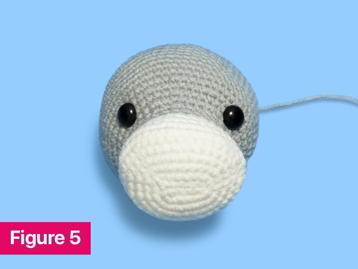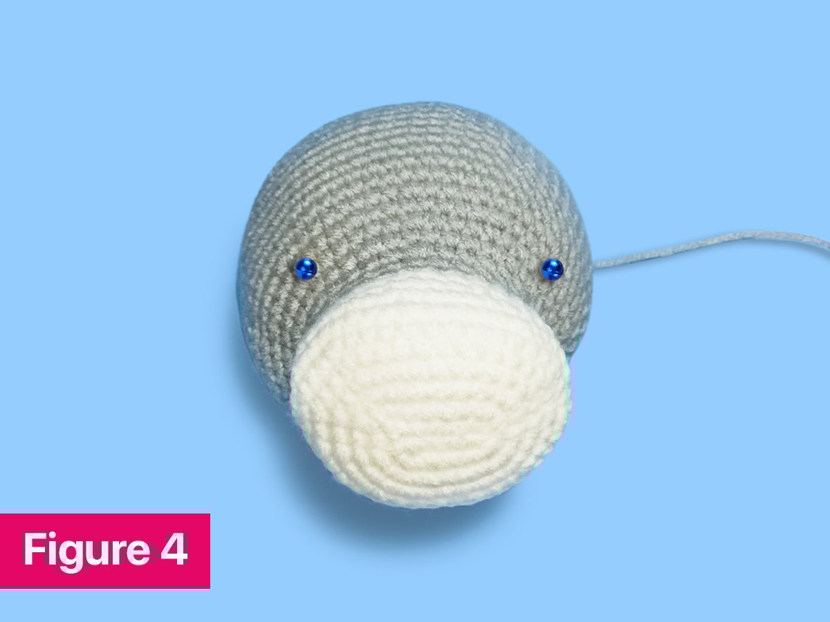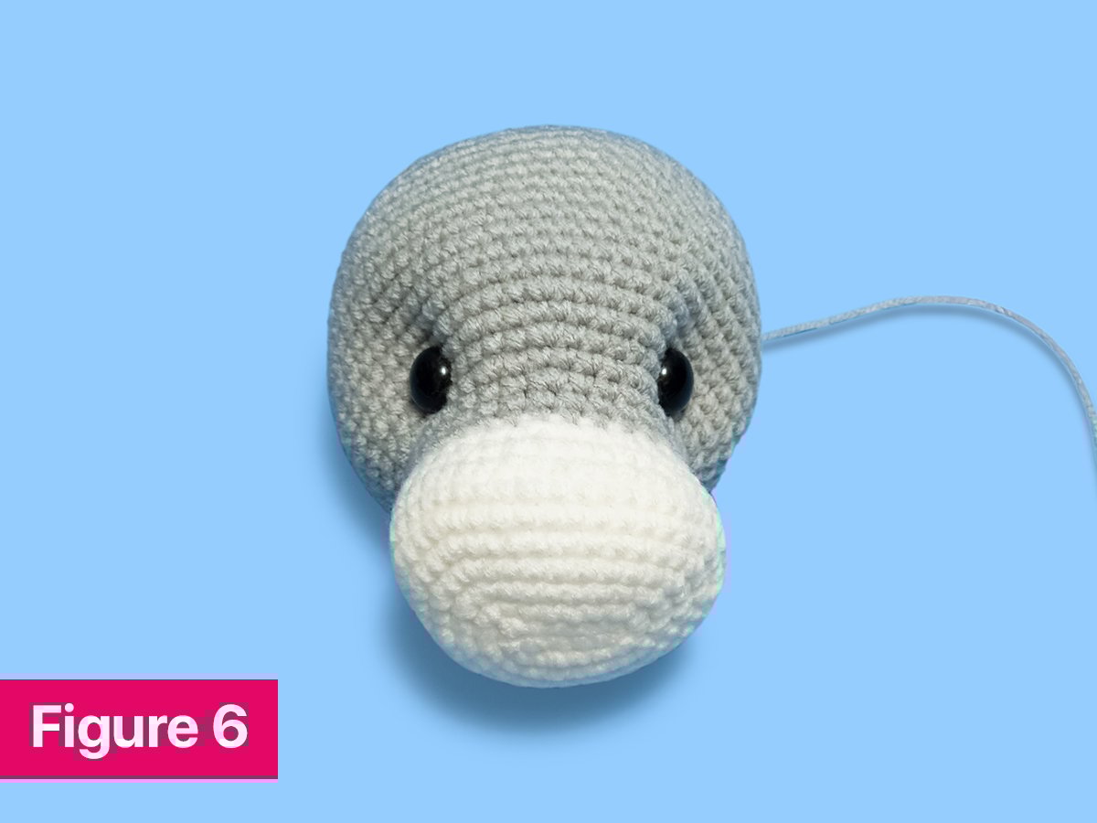 Indenting the Eyes: Using an 18-inch (46cm) strand of gray yarn and a yarn needle, indent the eyes by adding tension between them (see Figure 6). Watch my Indent Eyes 2.0 video.